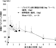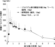 - Zolpidem蹲下OD片10mg“ Towa”和标准配方(普通锁),1片(10 mg作为Zolpidem攻丝)通过交叉方法(10 mg Zolpidem)快速倒入(n = 16,无水)(n = 16))和使用水(n = 16))测量血浆不变的身体浓度,并根据90%置信区法律对获得的药物体参数(AUC,CMAX)进行统计分析。(0.80)至原木(1.25),生物学(1.25)两种药物的等效性均得到证实1) 。