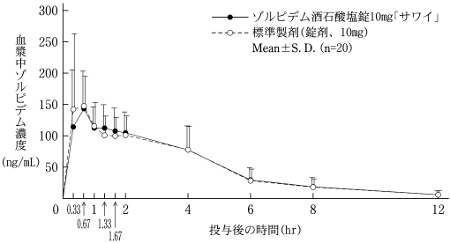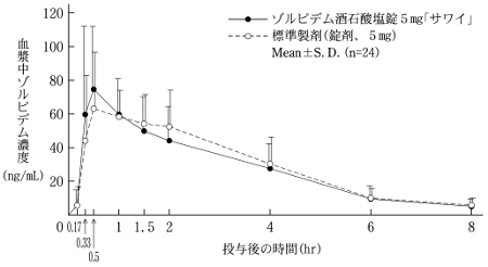 Zolpidem蹲下片5毫克“ Sawai”,标准制剂是健康的成年男孩的一片片剂(5 mg作为Zolpidem攻击),并测量了血浆Zolpidem浓度。由于对获得的药代动力学参数(AUC,CMAX)的统计分析,证实了两种药物的生物等效性。 1)