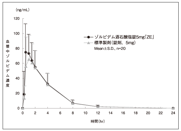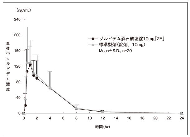 - Zolpidem蹲下锁5毫克或Zolpidem蹲片10毫克“ ZE”,每种标准制剂(5毫克或10毫克作为Zolpidem说话)通过交叉方法(5 mg或10 mg或10毫克)健康的成年男孩固定在快速的 - 充满固定的成年男孩。由于对90%置信区定律的统计分析(AUC,CMAX)的统计分析,它在log(0.80)到log(1.25)的范围内。两种药物的生物学等效性已得到证实。