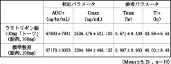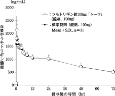 - ラモトリギン錠100mg「トーワ」と標準製剤を、クロスオーバー法によりそれぞれ1錠(ラモトリギンとして100mg)健康成人男子に絶食単回経口投与(かみくだいて水で服用(n=31)及びそのまま水で服用(n=19))して血漿中未変化体濃度を測定し、得られた薬物動態パラメータ(AUC、Cmax)について90%信頼区間法にて統計解析を行った結果、log(0.80)〜log(1.25)の範囲内であり、両剤の生物学的同等性が確認された4) 。