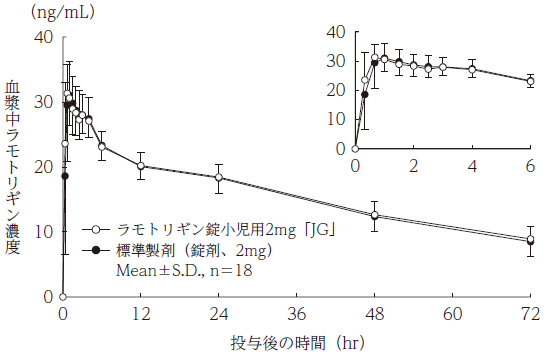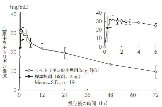 - ラモトリギン錠小児用2mg「JG」と標準製剤を、クロスオーバー法によりそれぞれ1錠(ラモトリギンとして2mg)健康成人男子に水150mLとともに絶食単回経口投与して血漿中未変化体濃度を測定し、得られた薬物動態パラメータ(AUC、Cmax)について90%信頼区間法にて統計解析を行った結果、log(0.80)〜log(1.25)の範囲内であり、両剤の生物学的同等性が確認された。 2)