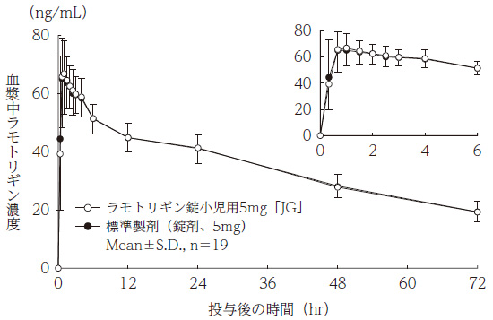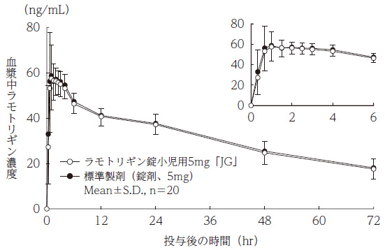 - ラモトリギン錠小児用5mg「JG」と標準製剤を、クロスオーバー法によりそれぞれ1錠(ラモトリギンとして5mg)健康成人男子に水150mLとともに絶食単回経口投与して血漿中未変化体濃度を測定し、得られた薬物動態パラメータ(AUC、Cmax)について90%信頼区間法にて統計解析を行った結果、log(0.80)〜log(1.25)の範囲内であり、両剤の生物学的同等性が確認された。 3)
