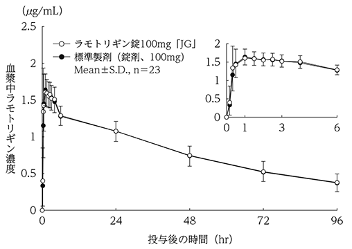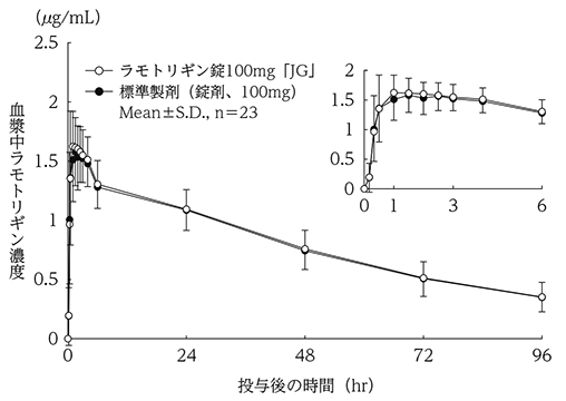 - ラモトリギン錠100mg「JG」と標準製剤を、クロスオーバー法によりそれぞれ1錠(ラモトリギンとして100mg)健康成人男子に水150mLとともに絶食単回経口投与して血漿中未変化体濃度を測定し、得られた薬物動態パラメータ(AUC、Cmax)について90%信頼区間法にて統計解析を行った結果、それぞれlog(1.00)〜log(1.03)及びlog(0.97)〜log(1.06)と、log(0.80)〜log(1.25)の範囲内であり、両剤の生物学的同等性が確認された。 5)