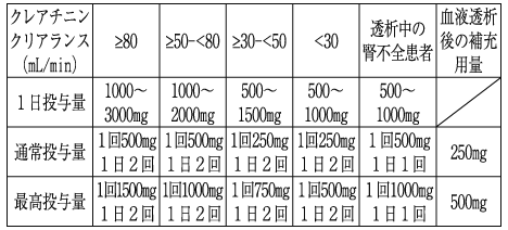 - 在为成人肾功能障碍的患者使用该药物时,请调整该药物的剂量和给药间隔,作为下表所示的肌酐清除值的参考。在接受血液透析的成年患者中,除了根据肌酐清除率的每日剂量外,还应在进行血液透析后进行额外给药。由于此处显示的使用和剂量是基于模拟结果,因此请调整使用和剂量,同时仔细观察每个患者。
