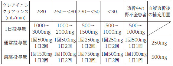 - 在为成人肾功能障碍的患者使用该药物时,请调整该药物的剂量和给药间隔,作为下表所示的肌酐清除值的参考。在接受血液透析的成年患者中,除了根据肌酐清除率的每日剂量外,还应在进行血液透析后进行额外给药。由于此处显示的使用和剂量是基于模拟结果,因此请调整使用和剂量,同时仔细观察每个患者。