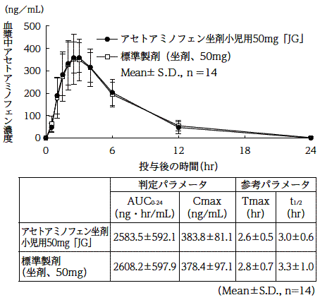 - 50 mg的“ JG”和乙酰氨基抑制儿童的标准配方,通过跨界方法(50 mg作为对乙酰氨基酚)(50 mg作为对乙酰氨基酚)(50 mg作为乙酰氨基芬)测量健康成人男孩直肠的血浆乙酰氨基酚浓度。对于根据90%置信区定律所获得的药物体参数(AUC,CMAX),它在log(0.80)到log(1.25)的范围内,并确认了两种药物的生物学当量。 1)