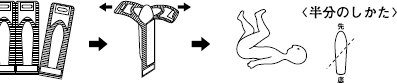 - ・要取出这种药物,首先将容器切成一个,如图所示,从上端的接缝撕裂,然后去除栓剂。当使用1/2时,如图所示,抑制被对角线切割。