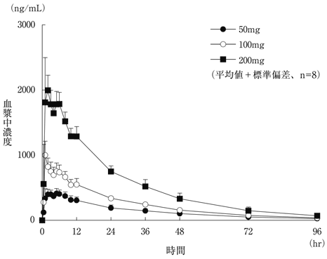 当日本健康的成年人在饭后一天(仅在第七天禁食)后7天有50毫克,100毫克和200毫克时,最终给药后,saffinamide的等离子体药物和脱离剂如下。稻田。当反复给药时,CMAX和AUC与剂量成比例增加。 CMAX和AUC 0-24的累积系数(第7 /第一天的比率)为1.9至2.0,每种剂量中没有积累,并且在给药的第六天稳定