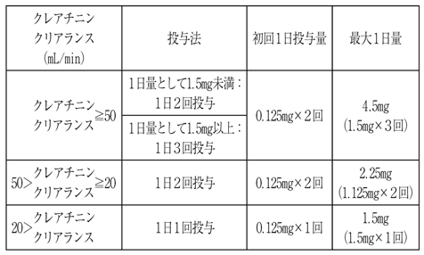 - 该药物主要在尿液中排出,因为它没有变化,但在老年人中,肾功能通常会降低,因此患者的患者(例如,从少量开始给药(每天0.125 mg一次)。条件。