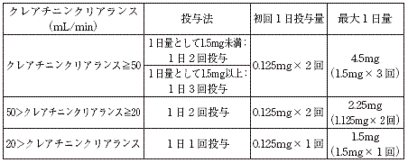 - 该药物主要在尿液中排出,因为它没有变化。如果该药物是针对肾功能障碍(肌酐清除率少于50 mL/m)的患者的,则将给药方法的数量调整为以下给药方法的指南,因为肾通量减少了肾脏清除率的降低。小心增加,同时注意肾功能。下表显示了肾功能障碍患者的最多一天和最大量。另外,由于透析患者或非常高级的肾功能障碍患者没有足够的用途,因此应在观察病情的同时仔细治疗此类患者。 [请参阅“护理”和“对老年人的管理”]