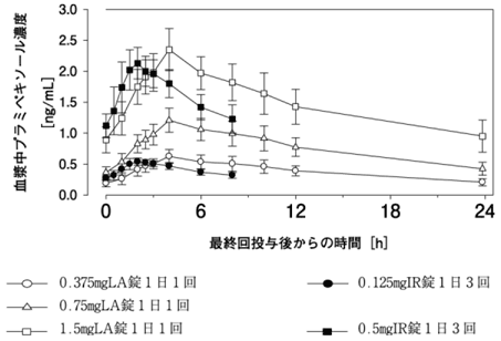0.375毫克,0.75毫克,1.5毫克(IR片剂)0.125 mg,0.125毫克1.5毫克,每天3次(8-8-8小时间隔)的健康成年人,以下图如下图所示。每日饭后反复管理时会发生变化。在给药后长达24小时,检查了LA片剂,并且在给药后长达8小时检查IR片剂。 LA锁定时的血浆浓度转变曲线在剂量之间的形状相似,并且观察到剂量依赖性暴露的增加。与同一天的IR片剂给药相同的每日剂量,t -max,ss之后的SS ,C Max,SS稍高,而C Minin,SS略低。在稳定状态下AUC 0-24和AE 0-24的统计评估中,确定双蒙罗金的暴露是生物学3)