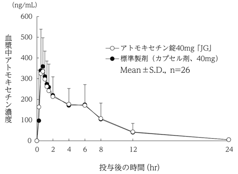 - Atmoxetine片剂40 mg“ JG” 1片和1个胶囊(40 mg As aromoxetine),并将交叉方法施用到大型透明的成年男孩中,以测量血浆不愉快的浓度。根据90%的置信部分进行统计分析。对于药代动力学参数(AUC,CMAX),它在对数(0.80)内(1.25)范围内,并确认了两种药物的生物当量。四)