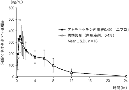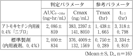 - 生物当量测试<br> 0.4%的原子苷和10 mL和10 mL(40 mg artomoxetine)分别在交叉方法中,大众成人男孩*吃一次口腔爆发。测量了浓度。根据90%置信区定律的统计分析(AUC 0→24HR ,CMAX)的统计分析,它在log(0.80)到log(1.25)的范围内,并且两者都在生物学等效的范围内毒品。确认性别。 1)