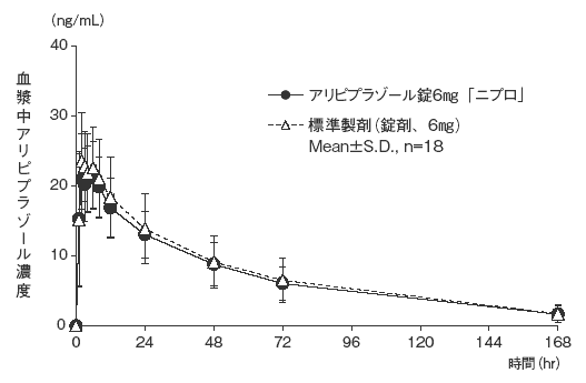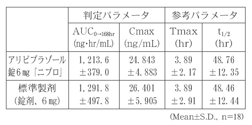 - アリピプラゾール錠6mg「ニプロ」と標準製剤のそれぞれ1錠(アリピプラゾールとして6mg)を、クロスオーバー法により健康成人男子に絶食単回経口投与して血漿中アリピプラゾール濃度を測定した。得られた薬物動態パラメータ(AUC 0→168hr 、Cmax)について90%信頼区間法にて統計解析を行った結果、log(0.80)〜log(1.25)の範囲内であり、両剤の生物学的同等性が確認された。 2)