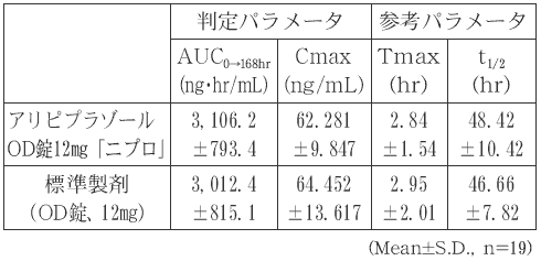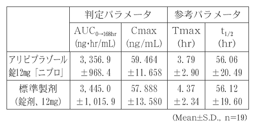 - アリピプラゾール錠12mg「ニプロ」と標準製剤のそれぞれ1錠(アリピプラゾールとして12mg)を、クロスオーバー法により健康成人男子に絶食単回経口投与して血漿中アリピプラゾール濃度を測定した。得られた薬物動態パラメータ(AUC 0→168hr 、Cmax)について90%信頼区間法にて統計解析を行った結果、log(0.80)〜log(1.25)の範囲内であり、両剤の生物学的同等性が確認された。 3)