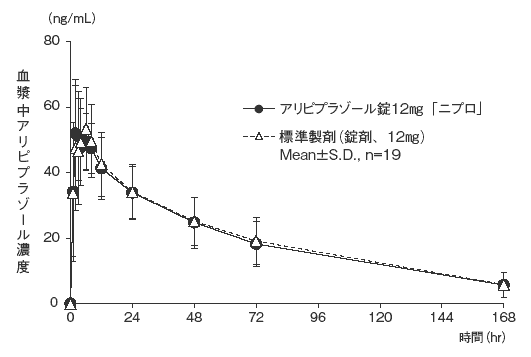 血漿中濃度並びにAUC、Cmax等のパラメータは、被験者の選択、体液の採取回数・時間等の試験条件によって異なる可能性がある。 - (3)アリピプラゾール錠12mg「ニプロ」