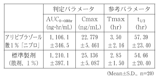 - アリピプラゾール散1%「ニプロ」と標準製剤のそれぞれ0.6g(アリピプラゾールとして6mg)を、クロスオーバー法により健康成人男子に絶食単回経口投与して血漿中アリピプラゾール濃度を測定した。得られた薬物動態パラメータ(AUC 0→168hr 、Cmax)について90%信頼区間法にて統計解析を行った結果、log(0.80)〜log(1.25)の範囲内であり、両剤の生物学的同等性が確認された。 4)