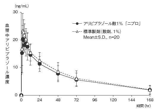 血漿中濃度並びにAUC、Cmax等のパラメータは、被験者の選択、体液の採取回数・時間等の試験条件によって異なる可能性がある。 - (4)アリピプラゾール散1%「ニプロ」