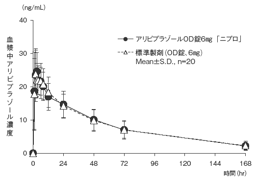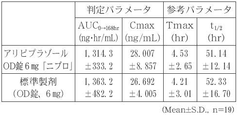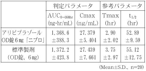 - アリピプラゾールOD錠6mg「ニプロ」と標準製剤のそれぞれ1錠(アリピプラゾールとして6mg)を、クロスオーバー法により健康成人男子に絶食単回経口投与して血漿中アリピプラゾール濃度を測定した。得られた薬物動態パラメータ(AUC 0→168hr 、Cmax)について90%信頼区間法にて統計解析を行った結果、log(0.80)〜log(1.25)の範囲内であり、両剤の生物学的同等性が確認された。