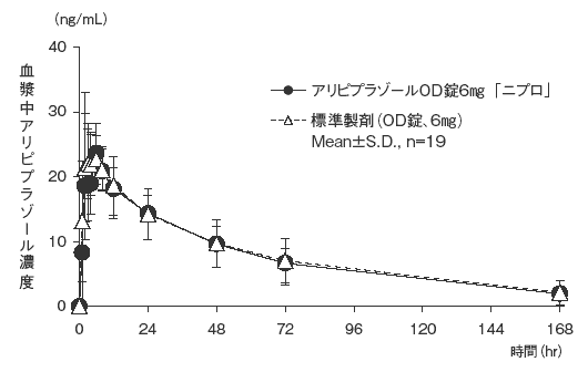 血漿中濃度並びにAUC、Cmax等のパラメータは、被験者の選択、体液の採取回数・時間等の試験条件によって異なる可能性がある。 - (5)アリピプラゾールOD錠3mg「ニプロ」