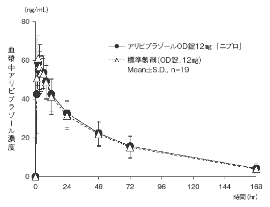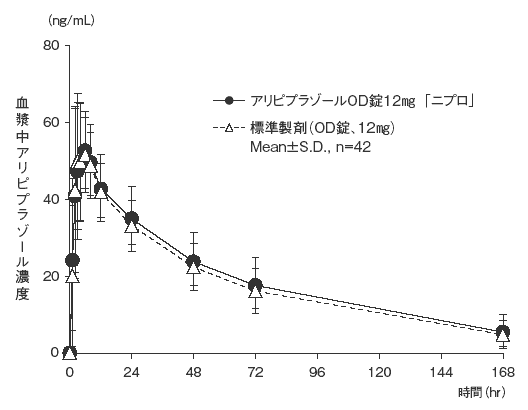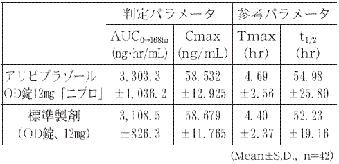 - アリピプラゾールOD錠12mg「ニプロ」と標準製剤のそれぞれ1錠(アリピプラゾールとして12mg)を、クロスオーバー法により健康成人男子に絶食単回経口投与して血漿中アリピプラゾール濃度を測定した。得られた薬物動態パラメータ(AUC 0→168hr 、Cmax)について90%信頼区間法にて統計解析を行った結果、log(0.80)〜log(1.25)の範囲内であり、両剤の生物学的同等性が確認された。