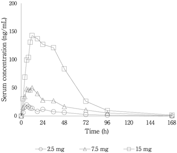 在145例服用该药物0.25、0.48和0.66 mg/kg的患者的浓度下,基于血清浓度下血清的身体分析的药物分析的结果,该患者已施用为0.25、0.66 mg/kg) _ AS /mL(均为平均值±标准偏差) 3)